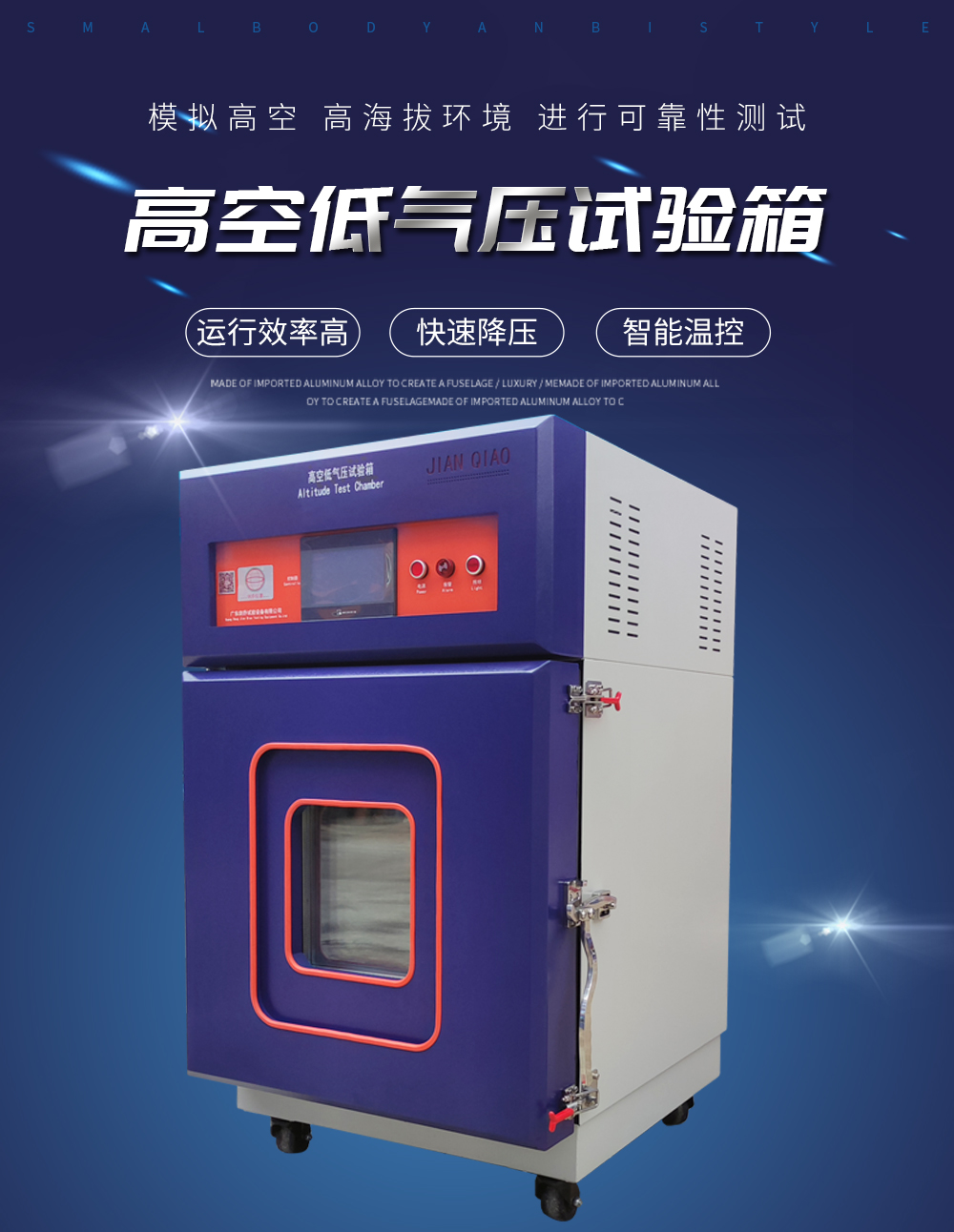 高空低氣壓試驗箱可以模擬高海拔、高空、(高原地區)氣候進行貯存運用、運輸可靠性試驗,并可同時對試件通電進行電氣性能參數的測試設備。適用于國防工業,航天工業自動化零組件,汽車部件,電池,平面顯示屏模組工業及相關產品料進行環境試驗 - 高溫試驗、低溫試驗、溫度變化試驗、低氣壓試驗、溫度高度試驗、低溫/低氣壓綜合試驗、高溫/低氣壓綜合試驗。