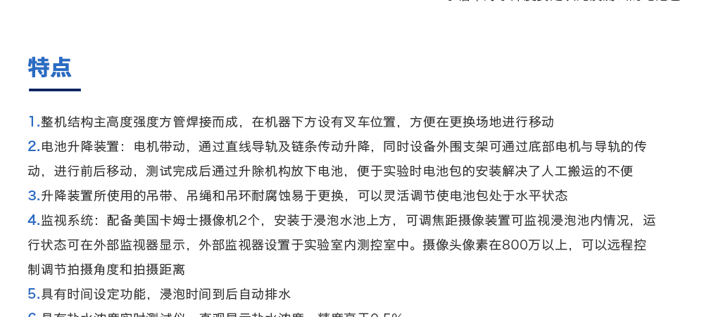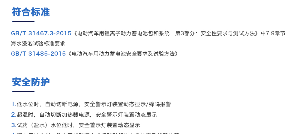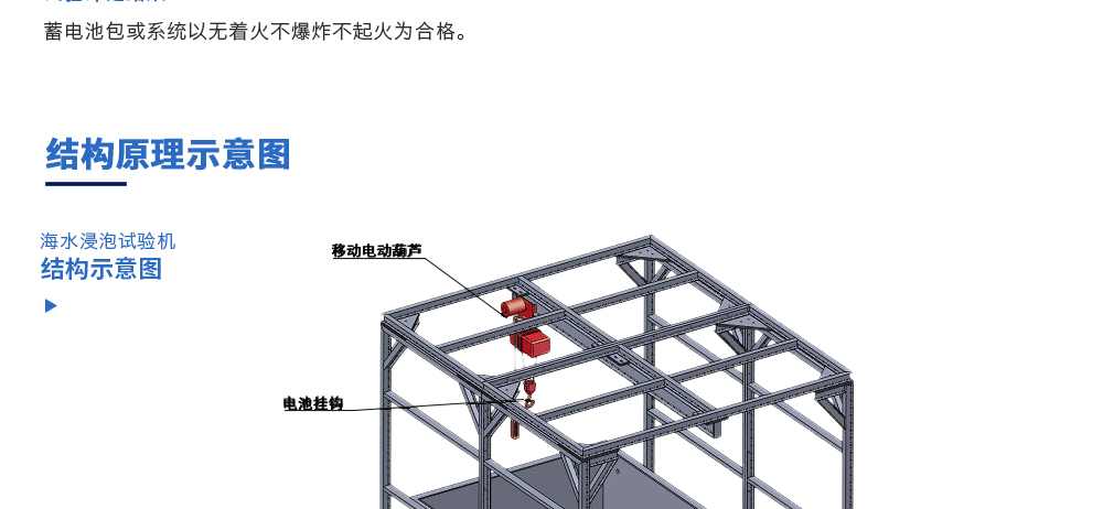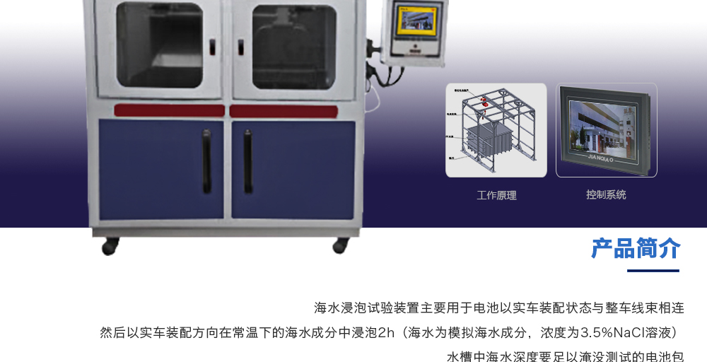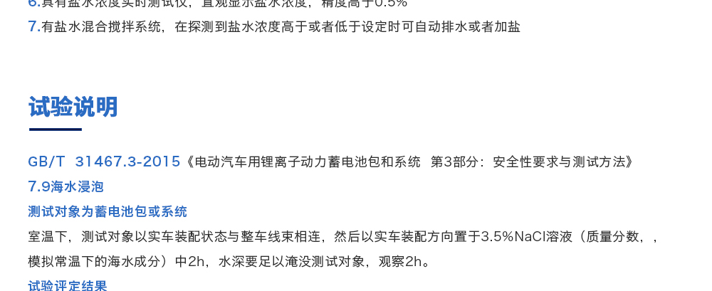 用途:海水浸泡試驗(yàn)裝置主要用于電池以實(shí)車裝配狀態(tài)與整車線束相連然后以實(shí)車裝配方向在常溫下的海水成分中浸泡2h(海水為模擬海水成分,濃度為3.5%NaCl溶液)水槽中海水深度要足以淹