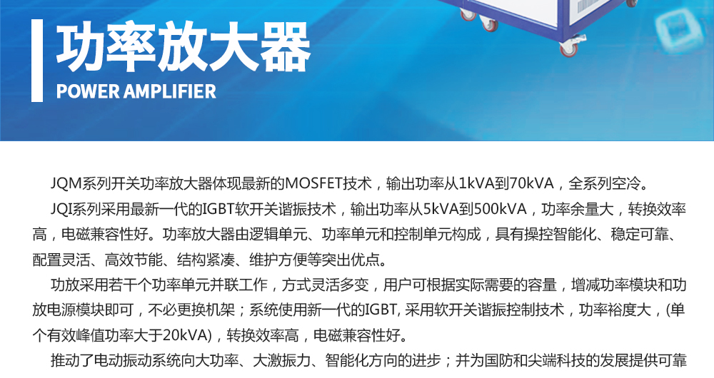 用途:功率放大器由邏輯單元、功率單元和控制單元構成,具有操控智能化、穩(wěn)定可靠、配置靈活、高效節(jié)能、結構緊湊、維護方便等突出優(yōu)點。